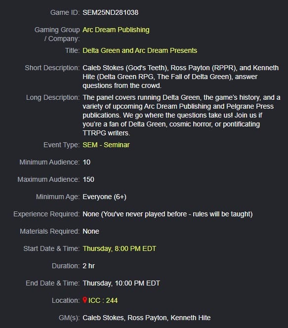 The DG stay-behind operation of Caleb Stokes, Ross Payton, and Kenneth Hite will be in attendance at GenCon 2025. For all who want to hear the annual Arc Dream update face-to-face, bring your questions July 31st @ 8pm EDT in ICC: 244. For those who can't be there, we will record the panel.